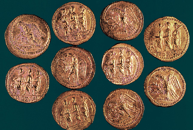Primele monede geto-dace au apărut prin secolul al III-lea î.Hr. și imitau pe cele macedonene (emise de Filip al II-lea, Alexandru cel Mare, Filip al III-lea). Bătute din argint, după cum atestă tezaurele descoperite la Jiblea (județul Vâlcea), Dumbrăveni (județul Vrancea), monedele geto-dace și-au încetat existența către sfârșitul secolului al II-lea î.Hr și primele decenii ale secolului I î.Hr., o dată cu pătrunderea în regiune a denarului roman (denarius). Aceștia vor domina economia dacică inclusiv în secolul al II-lea d.Chr. Explicația constă în descoperirea unei monetării în cadrul căreia moneda romană republicană era falsificată în așezarea de la Sarmizegetusa Regia. Numărul mare de monete romane republicane descoperite putând fi explicate și în acest sens, nu doar prin relațiile comerciale înfloritoare între lumea dacică și cea greco-romană.