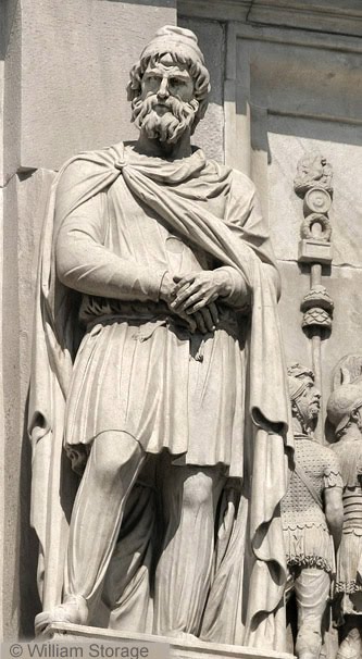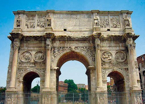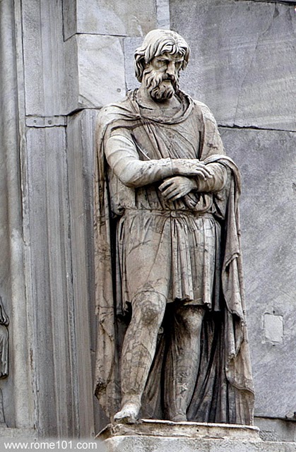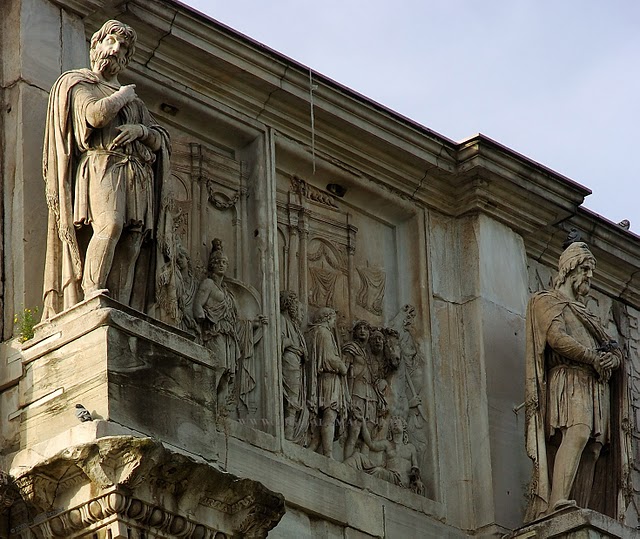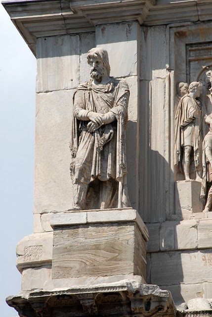 In luna februarie, la orele opt ale diminetii, Roma inca nu este inundata de turisti. Aproape de Colosseum, pe drumul pe care imparatii romani isi desfasurau procesiunile triumfale, se afla cel mai mare arc de triumf din Roma, ramas in picioare din antichitate. Este Arcul lui Constantin, ridicat de senat in cinstea acestuia dupa victoria sa de la podul Milvius, impotriva lui Maxentiu. Evenimentul se intampla la inceputul secolului al IV-lea al erei crestine. Patru dintre basoreliefurile de pe acest arc infatiseaza scene de lupta dintre daci si romani. Trecusera deja doua secole de la aceste lupte, dar ele, se pare, mai dainuiau in memoria romanilor. Se considera ca aceste basoreliefuri faceau parte, initial, dintr-un monument al lui Traian, apoi au fost refolosite la monumentul lui Constantin. Capul lui Traian din aceste scene a fost inlocuit cu cel al lui Constantin, dar dacii nu au putut fi inlocuiti. Dar, fapt si mai tulburator, pe cele opt coloane corintice cu care este ornat arcul, patru pe o parte si patru pe cealalta parte, se afla opt statui colosale de daci. Aceste statui impresionante strajuiesc arcul la o inaltime de aproape 25 de metri. Patru dintre ele reprezinta nobili daci, iar celelalte patru, oameni de rand, fara caciuli. Cu totii au o atitudine demna, au capetele usor aplecate si mainile impreunate. Au barbi falnice, pletele le flutura liber sau se scurg de sub caciuli. Mantiile, ornate cu franjuri pe margini, sunt prinse pe un umar si le ajung pana la calcaie. Pantalonii sunt stransi la glezne, in picioare au opinci.
