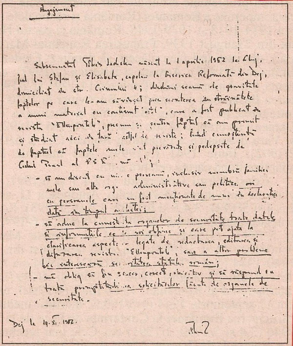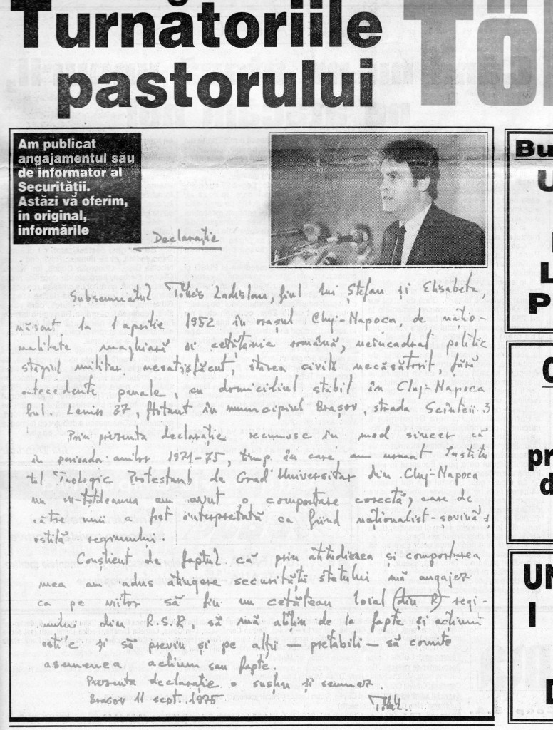 “Pro forma: S-au identificat si facut publice documentele esentiale care dovedesc ca Laszlo Tokes, la 11 septembrie 1975, lasa judecatii istoriei urmatoarea consemnare olografa: “Constient de faptul ca prin atitudinea si comportarea mea am adus atingere securitatii statului ma angajez ca pe viitor sa fiu un cetatean loial regimului din R.S.R.”. De facto: Informatorul “Laszlo Kolozsvari“ a furnizat informatii in temeiul carora anumite persoane, inclusiv cetateni ai altor state ( Klass Eldering, Ida Eldering, Lajos Gudor, Ioszef Demeter, Laszlo Ferenczi, Sandor Farkas, Ioszef Otvos, Tamas Jenci, Noemi Szebeni, Laszlo Vetesi, Sandor Gede s.a.) au facut obiect al unor masuri de prevenire a activitatilor de natura a prejudicia securitatea statului roman”. (“Tinerama”, nr.210, 21-27 decembrie 1994, director Max Banus). In luna noiembrie a anului trecut “Cotidianul” a publicat o documentare in extenso a Cazului Tokes, in care se afirma ca a fost si informator al Securitatii si agent strain, pasibil de pedeapsa pentru tradare. Si cu toate acestea, “Cotidianul” nu a fost dat in judecata.
