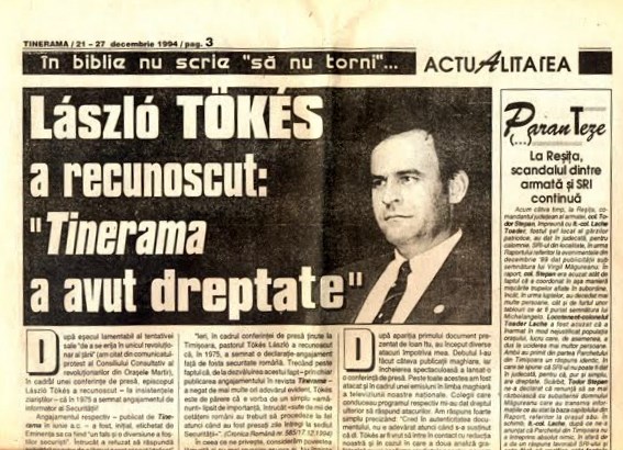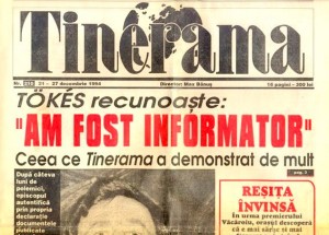 Dar deconspirarea lui Laszlo Tokes in presa centrala dateaza, dupa cum am amintit, din anii ’90. In saptamanalul “Tinerama”, Max Banus si Ioan Itu sunt primii care i-au publicat la Bucuresti si Angajamentul si cateva Note informative, de care, insa, CNSAS nu a tinut cont. Posibil ca tocmai de aceea Laszlo Tokes a insistat sa-l dea in judecata pe ziaristul oradean, pentru a castiga procesul in provincie, chiar in orasul fostului sau scaun” episcopal, si a se prevala in viitor de o noua hotarare pentru a-si spala trecutul. O sa reproducem din “Tinerama” anilor ’90 cateva randuri, edificatoare: