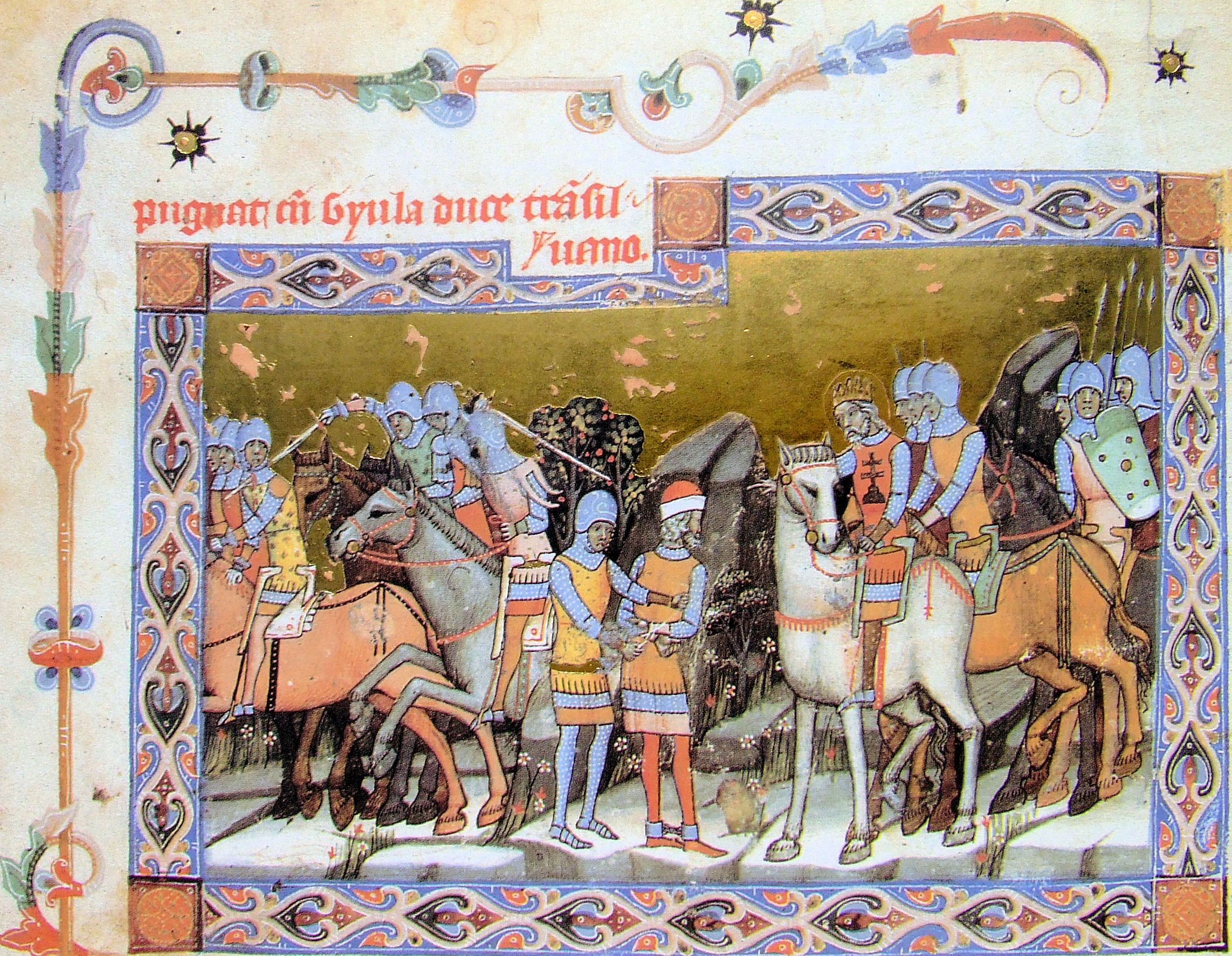 Cronica pictată de la Viena: regele Ștefan îl capturează în 1003 pe Geula cel Tânăr.