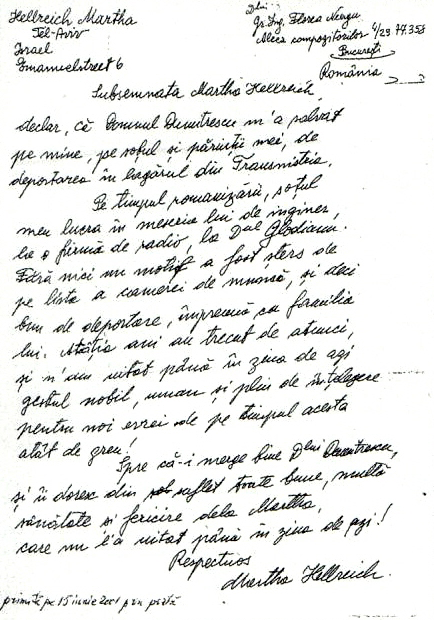 De asemenea, Florea Neagu păstrează la loc de cinste o scrisoare primită de la Marta Hellreich, una dintre evreicele salvate de la deportare și moarte, împreună cu întreaga ei familie, prin simpa (vorba vine!) angajare la fabrica Tricotania de către Cornel Dumitrescu. „Subsemnata Marta Helldrich declar că domnul Dumitrescu m-a salvat pe mine, pe soțul și pe părinții mei de la deportarea în lagărul din Transnistria”, își începe scrisoarea bătrâna evreică, urându-I salvatorului ei sănătate, fără a ști, din Israelul anului 2000, că românul Cornel Dumitrescu decedase în 1976.