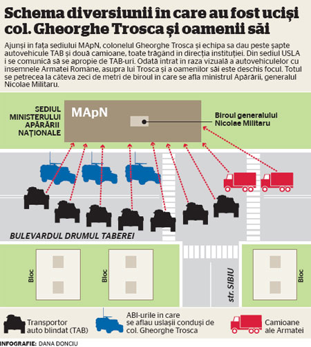 În noaptea de 22 spre 23 decembrie 1989, blocat într-un ABI în care se trăgea din toate direcţiile, colonelul Gheorghe Trosca îşi trăia ultimele clipe din viaţă, urlând speriat spre o staţie de emisie-recepţie: „Trag în noi! Trag în noi!”. Fusese chemat la sediul Ministerului Apărării Naţionale din cartierul Drumul Taberei pentru a-şi arăta loialitatea faţă de noua putere, prin anihilarea „teroriştilor ascunşi în tufişuri”.