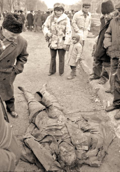 Ne-a cam fost teamă pe drum. Am luat-o pe jos, printre blocuri, apoi am ieşit spre Favorit şi am făcut dreapta către Orizont. Nu era lume multă pe străzi la orele prânzului. În ziua aceea de iarnă care începea să se aştearnă treptat, autobuzele nu circulau, iar noi priveam în sus după terorişti. Pe strada Dumul Taberei se vedeau multe tancuri şi soldaţi înarmaţi. Blocurile de vizavi erau ciuruite de gloanţe, unele apartamente aveau geamurile sparte. La 50 de metri de intrarea în minister (acum este Statul Major al Trupelor de Uscat), am văzut o privelişte pe care n-o voi uita niciodată. Pe strada aceea încremenită, dar securizată la maximum, într-o linişte aducătoare de nelinişti, două maşini Aro vopsite în verde erau distruse complet. Aveau turele pe care erau montate mitraliere, erau blindate, neobişnuite pentru noi. În jurul şi în interiorul lor, cadavre carbonizate, cel puţin şase am numărat. Una dintre maşini era răsturnată, iar pe ambele era scris cu alb „TERORIŞTI”.