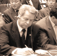 La Moscova, timpul nu era bun. Tovarăşul Gorbaciov personal m-a ajutat să ajung cu avionul mai repede la Chişinău şi venit astfel să vă felicit şi să vă ofer ajutorul nostru. Moldova, cei de acolo vor să vă transmit că sunt gata să colaboreze cu dumneavoastră, să-şi trimită tovarăşi aici, să se discute problemele acestei colaborări. Sunt probleme comune în anumite domenii şi dacă ne vom uni forţele tuturor oamenilor de ştiinţă, ale celor care lucrează în domeniile respective, numai aşa vom putea rezolva problemele.