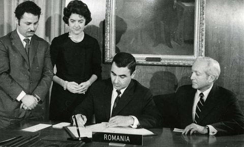 Washington,15 decembrie 1975. Florea Dumitrescu semnează acordul de aderare a României la FMI şi BIRD. În picioare, diplomatul Mircea Răceanu, aflat la post în SUA, şi soţia lui